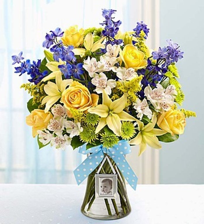 Celebrate the day with someone you care about that just had a beautiful baby boy. Send flowers to the family who had the bundle of joy and make their day a day to celebrate. This vase is arranged with yellow lily, white alstro, yellow roses, blue delphinium, green poms, solidago and much much more! Along with a FREE frame for the new baby picture!