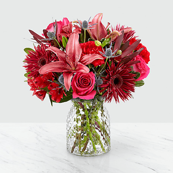 Celebrate today with Harvest the Day Bouquet, one of the most popular flower colors this year! Presented in a clear glass vase, this bouquet of dramatic flowers such as gerbera, lilies and roses is sure to brighten up their day.